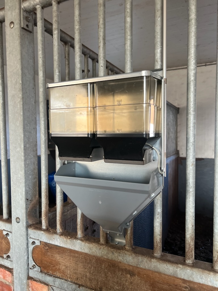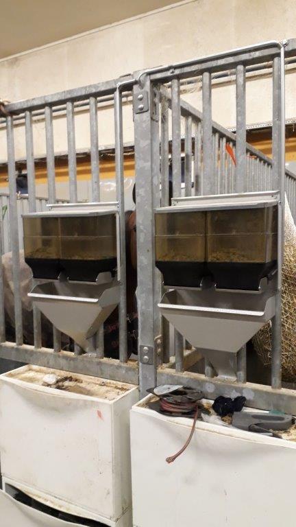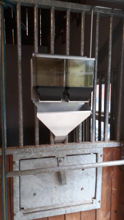 Foderautomatens smala ränna är 65 mm bred, och kan på ett flertal stallinredningar monteras med rännan mellan gallerrör.
